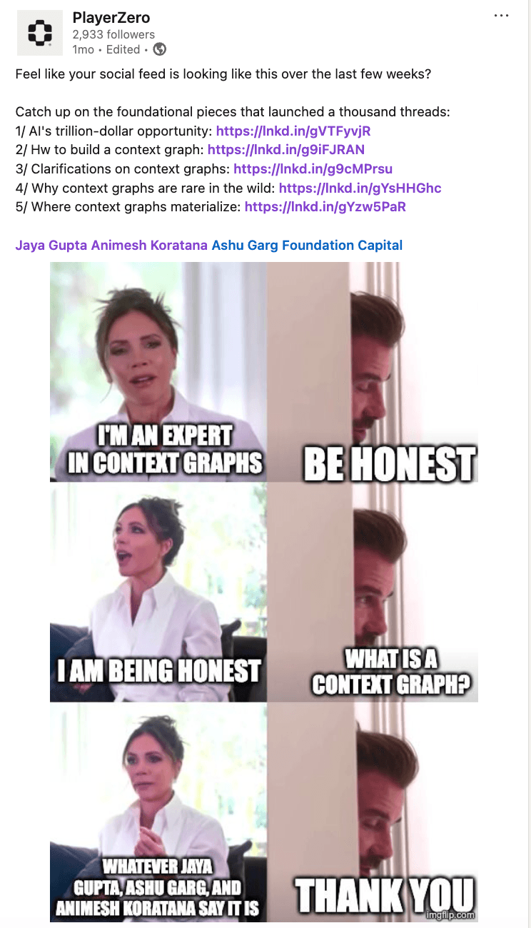 One day, after keeping PlayerZero’s social presence polished and buttoned up, Lara posted a meme on LinkedIn poking fun at the context graph trend that had been flooding developer feeds.