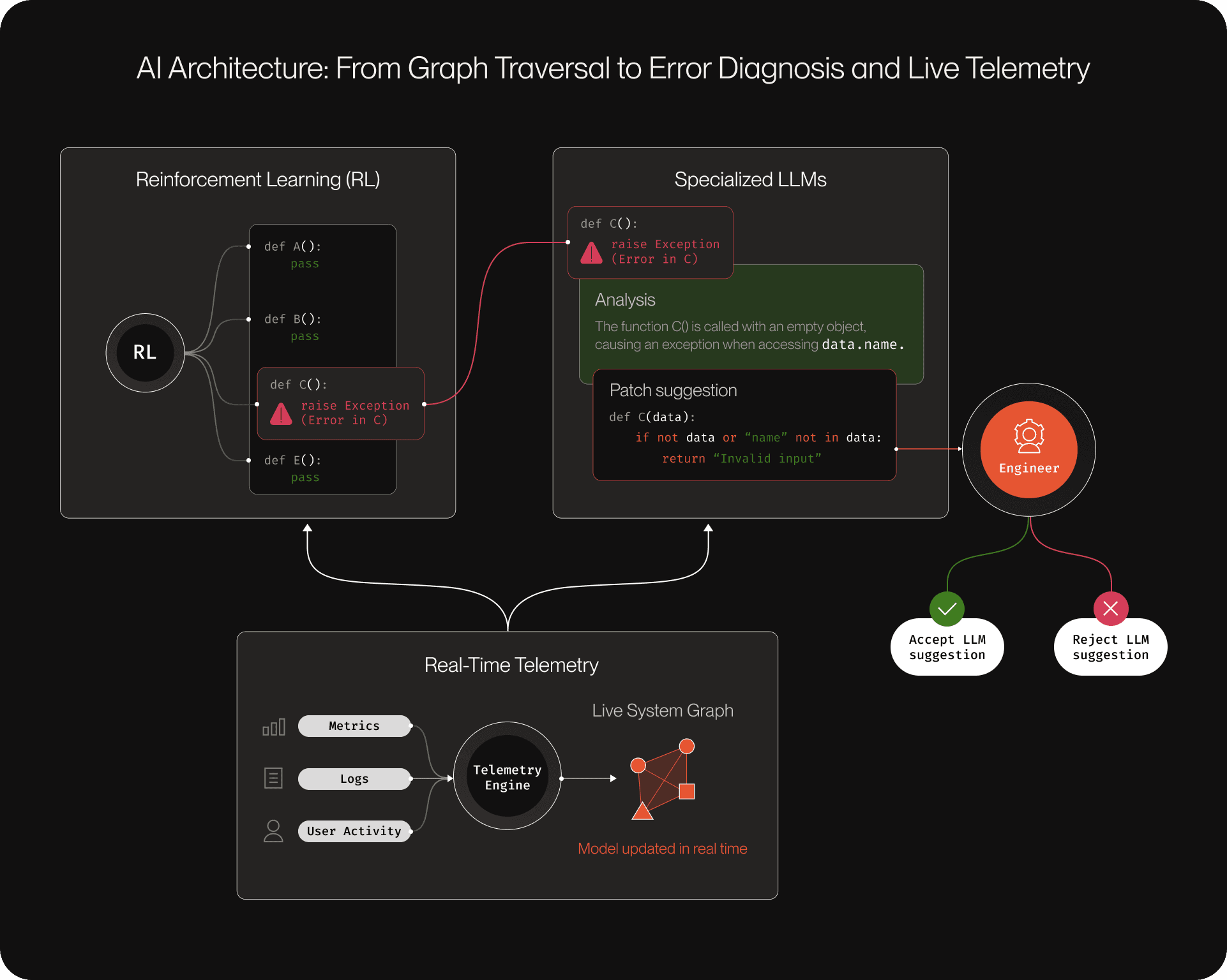 To achieve all this, PlayerZero's architecture employs a multi-model AI strategy that combines reinforcement learning (RL) for efficient graph traversal through complex codebases with specialized large language models (LLMs) optimized for error diagnosis and patch generation. This technical foundation is supported by comprehensive telemetry systems that monitor code execution in real-time, coupled with detailed user session tracing that captures developer interactions and system states.