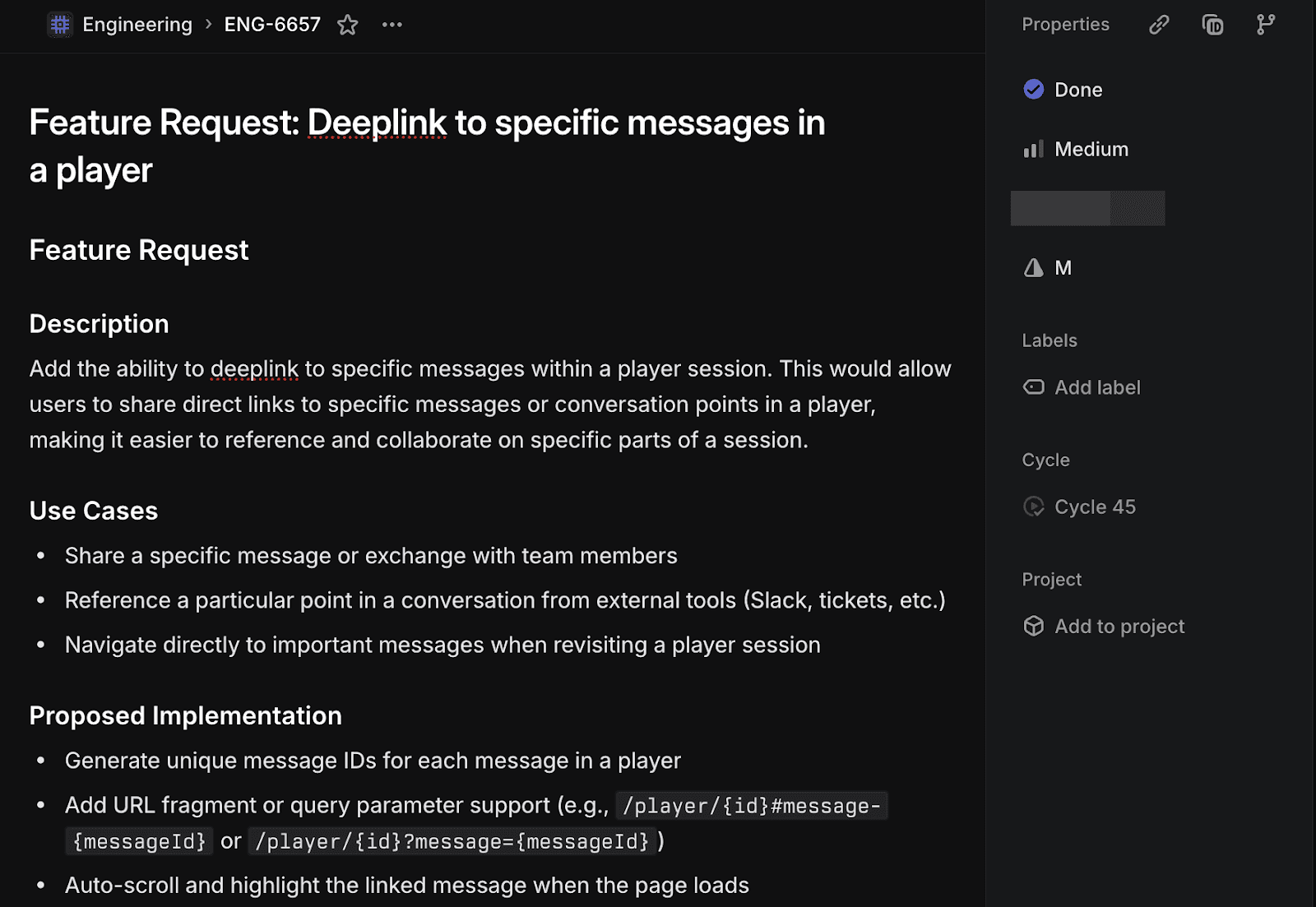 "@PlayerZero can you file a feature request ticket in linear for the feature described above, deeplinking to specific messages in a player?"